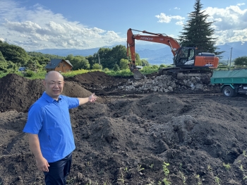 圃場整備のため、地中の巨石を撤去している塩川氏