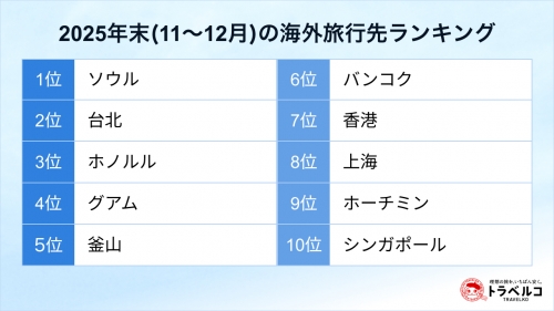 旅行比較サイト「トラベルコ」は、サイト内検索データに基づく「2025年末(11〜12月)の海外旅行先人気ランキング」を公表した。上位はソウル、台北、ホノルルで、直行便拡充や乾季入りを追い風にグアムが4位へ浮上、ホーチミンも秋シーズンのランキング圏外からトップ10入りした。11月は三連休が2回、年末年始は最大9連休取得の並びで、予約ピークの前倒し需要が見込まれる。