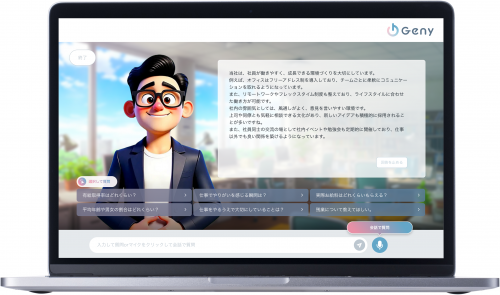 試験導入したのは、leanが開発したAIアバターサービス「Geny」。アバター化した社員が内定者の質問に応じる仕組みで、24時間いつでも相談できる環境を整え、入社前の心理的ハードルを下げる狙いだ。対面では聞きづらい内容も含め、内定者が本音で疑問を投げかけられる点を重視している。