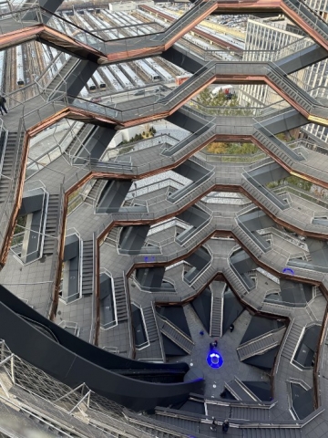 また、エッジのある30ハドソン・ヤードの前には新名所「ベッセル」が建つ。階段と踊り場が組み合わされたデザインのモニュメントで、言ってみれば超巨大なジャングルジムのよう。迷路のように40メートル以上も昇り降りをする必要があるので体力や足腰には要注意だが、他の展望施設とは異なるスリルを味わえる。