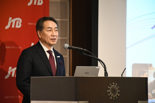 JTBは15日、グループ長期ビジョン「OPEN FRONTIER 2035」を発表した。山北栄二郎代表取締役社長執行役員が登壇し、2035年のありたい姿や事業ポートフォリオの転換方針を説明した。人口減少やAIの進展など社会構造の変化を背景に、交流の価値を中核とした持続的成長モデルへの転換を打ち出した。