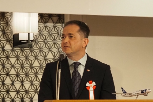 レセプションには駐日ポーランド共和国特命全権大使のパヴェウ・ミレフスキ氏も登壇。両国の歴史的な交流の深さを振り返るとともに、観光だけでなく、投資をはじめとしたビジネス面でパートナーであることを説明した。現在ポーランドには約350社の日系企業が進出しているとし、「今後の経済協力の発展と日本からの投資の拡大は需要なテーマ」と述べた。そのうえで、「交流が進む中で影で支えてくれているのがLOであり、日本とポーランドを結ぶ掛け橋の役割をしている」と謝意を表明した。