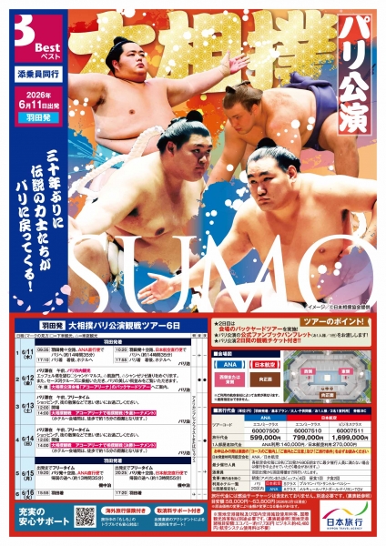 日本旅行は、30年ぶりに開催される大相撲パリ公演にあわせ、観戦チケット付きの6日間ツアーを発売した。日本相撲協会設立100周年の節目となる記念公演を商品化し、特別プログラムを盛り込んだ付加価値型商品として展開する。