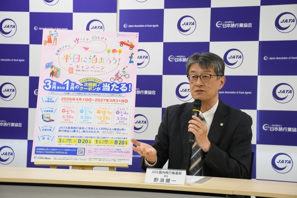 日本旅行業協会(JATA)は、国内旅行需要の平日シフトによる総需要拡大と混雑緩和を目的に実施している「平日に泊まろう!」キャンペーンを2026年度も継続する。インバウンド拡大が進むなか、日本人旅行需要の維持と平準化を業界横断で促す啓発施策として3年目に入る。