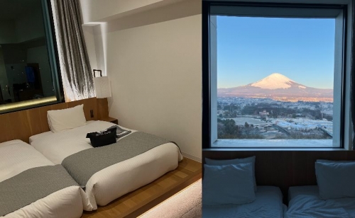 1泊2日のプログラムで1日目の夜から参加。宿泊の御殿場プレミアム・アウトレットにある「HOTEL CLAD」は、温泉リゾートホテルでアジア系旅行者が多い。快晴の朝、間近に見える富士山に感動した(ただし、天候によっては見えないことも)。