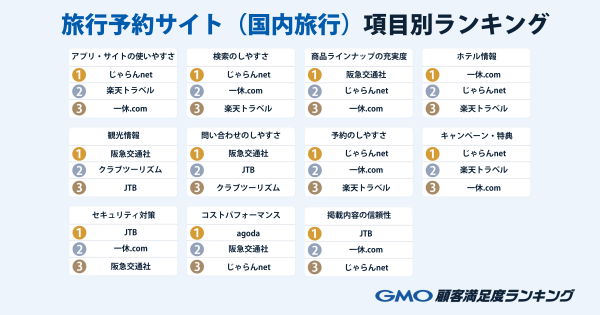 GMOインターネットグループのGMOリサーチ&AIは25日、「GMO顧客満足度ランキング」における2025年「旅行予約サイト(国内旅行)」カテゴリの結果を公表し、総合1位に一休.comが選出された。利用者が最も重視する項目は「コストパフォーマンス」で、次いで「予約のしやすさ」「掲載内容の信頼性」が続く結果となった。価格面に加え、操作性や情報の正確性が総合満足度を左右する傾向が明確となった。