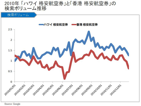 まず最初に、航空券の検索トレンドで、「ハワイ 格安航空券」と「香港 格安航空券」を比べてみましょう(図表2)。