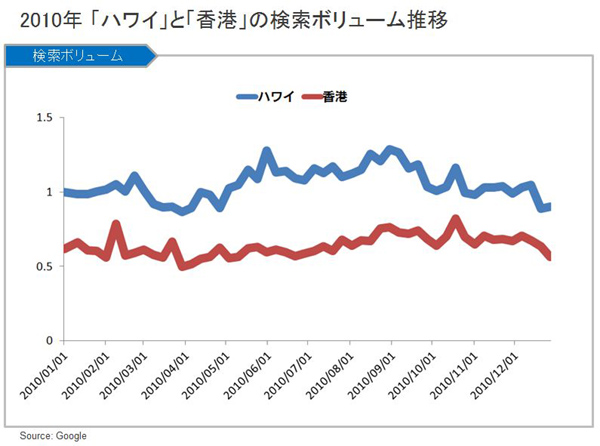 それでは次にホテルの検索はどうでしょうか? 同じく「香港 ホテル」「ハワイ ホテル」の検索数を指数化したものでみていきましょう(図表3)。