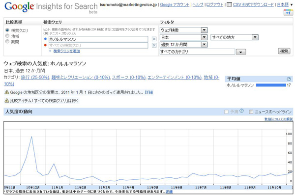 例えば下記は「ホノルルマラソン」の検索数のトレンドです。大会は毎年12月に開催されますが、「ホノルルマラソン」という検索は7月あたりから微増しはじめ、10月から上昇気流にのり、12月にピークに達することがわかります。このようにユーザーの検索トレンドを把握して、キャンペーンをどのタイミングから仕掛けるかの判断に活用してください。