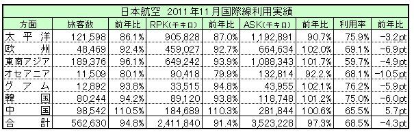 日本航空(JL)の2011年11月の国際線旅客数は、前年比5.2%減の56万2630人となった。東日本震災後、旅客数は40%減まで落ち込んだが、徐々に回復し、10月の8.9%減に続いて1ケタ減まで戻ってきた。ただし、座席供給量の2.7%減に対して旅客輸送量は8.6%減となり、需要が供給を下回っている。利用率は68.5%減で、前年よりも4.3ポイント低下した。