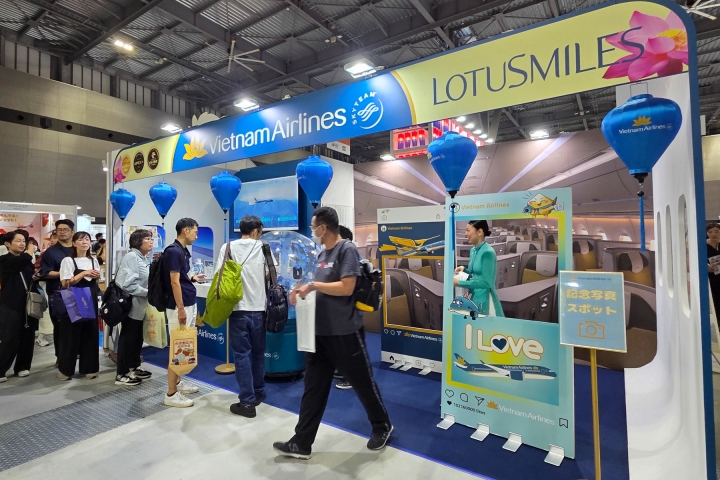 ベトナム航空のブースでは機内にいるかのような写真が撮れるフォトコーナーを設定。ユニフォームを着たスタッフの姿も
