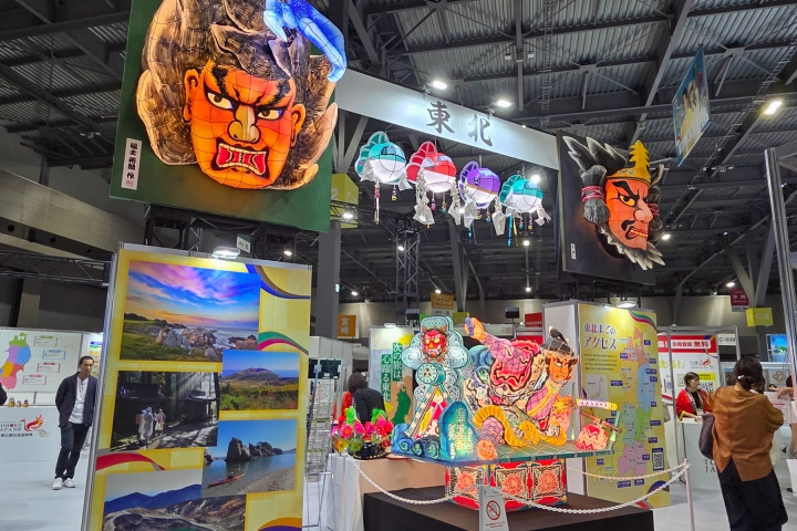 東北観光推進機構・JR東日本のブースは大きなねぶたが迫力満点。お酒やジュースの試飲が人気だった