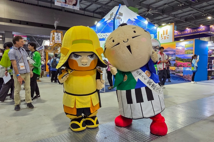 静岡県ブースの前では浜松市の「出世大名家康くん」と愛知県大河ドラマ『どうする家康』観光推進協議会の「いえやすくん」がコラボ