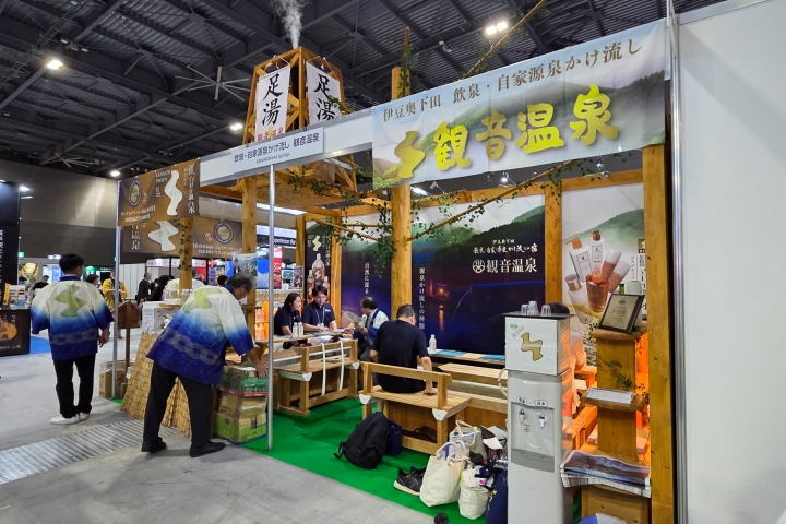 伊豆奥下田の観音温泉のブースはすっかりおなじみ。温泉水の試飲に歩き疲れた足をいやす足湯は今年も健在だった