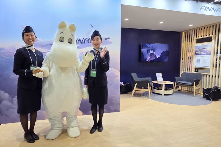 フィンエアーのブースにはムーミンが登場。ユニフォームを着たスタッフと写真が撮れる