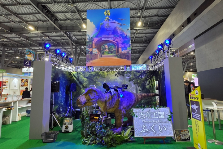 福井県では全長3.8m、高さ1.7mの恐竜に乗れるフォトスポットを用意。このほか名物の「おぼろ昆布」「油あげ」の販売も実施