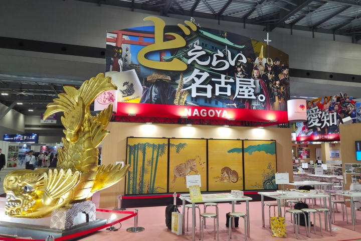 華やかな名古屋のブースには名古屋城の「金鯱」の実寸大模型の姿が。本丸御殿の「竹林豹虎図」レプリカもみどころだ