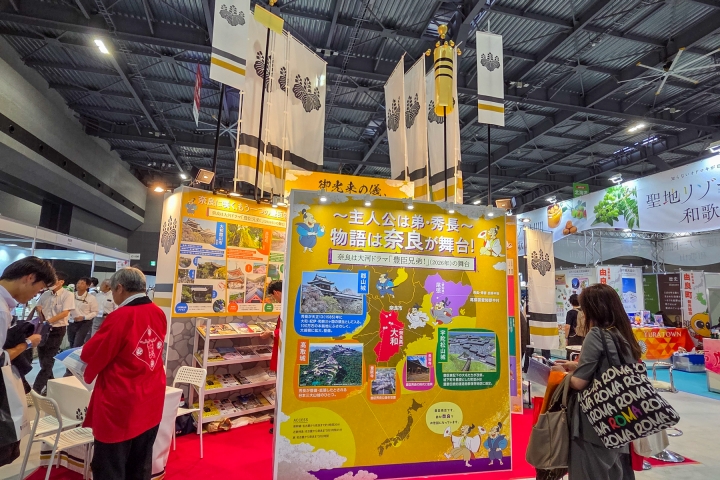 奈良県大河ドラマ『豊臣兄弟!』観光推進協議会のブースは豊臣家の旗を掲げてアピール。甲冑や陣羽織との写真撮影も