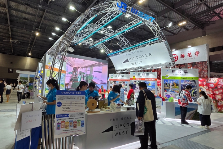 DISCOVER WESTのブースでは島根・鳥取・岡山・広島・山口県とJR西日本が連携。5県のクイズラリーと抽選会をおこなった