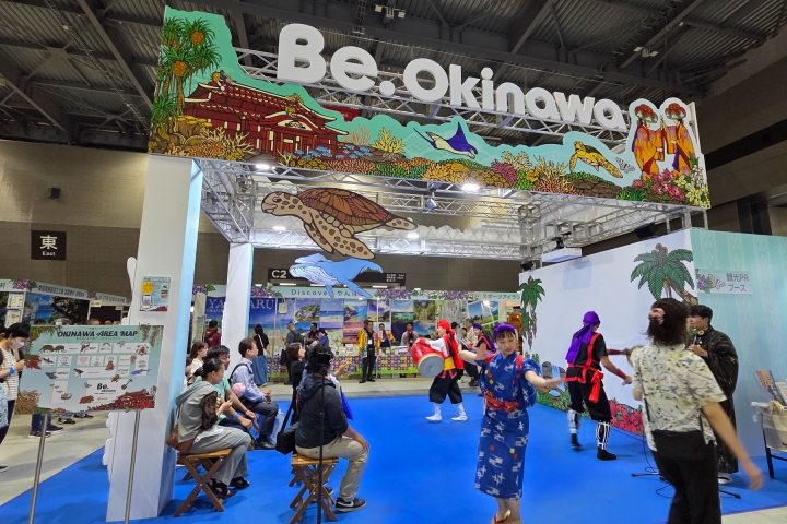 沖縄県は「冬の沖縄旅」テーマに展開。冬も温暖で花々が楽しめる様子をブースで表現した。ブース内ではエイサーの披露も