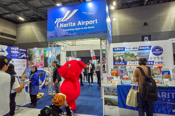 成田国際空港は「陸のアクセス」という観点からJR東日本、京成電鉄とともに出展。チーバくんも登場した