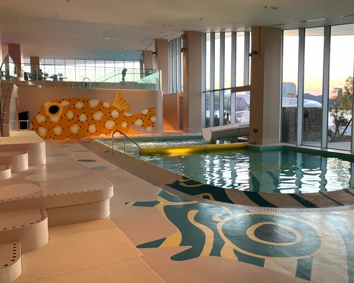 カラフルなふぐが描かれた「ふぐプール」では、小さな子どもから大人まで楽しめる5つのプールがある。外に飛び出したウォータースライダーは全長約30m。