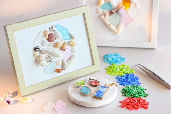 ペットボトルのキャップを利用したチャームづくりや貝殻とシーグラスをコラージュしたりのクラフトは、大人から子どもまで楽しめる(有料アクティビティ)。