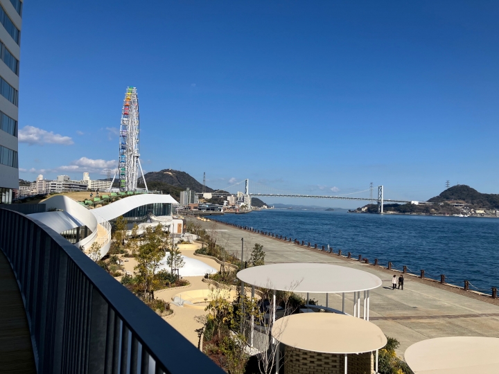 「緑地」、子どもが跳ねて遊べる「ふわふわドーム」、「憩いエリア」、「アペロエリア」のある地上の「ふぐビーチ」と海峡一望の「なみなみテラス」。