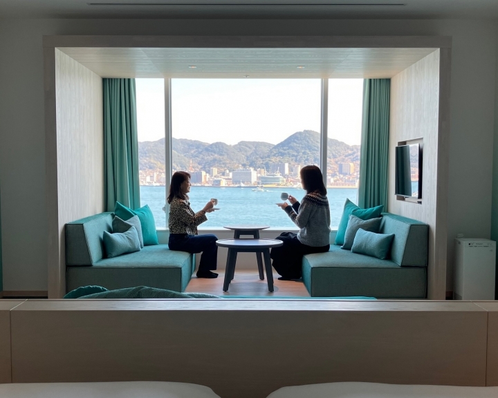 スーペリア(38㎡、4名定員、2万1000円~):窓際にはデイベッドソファがあり、行き交う船を眺めてくつろげる。