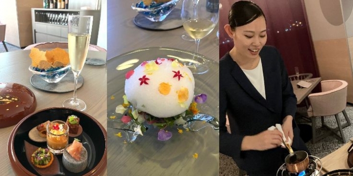 メインダイニング「OTTO SETTE SHIMONOSEKI」では、下関名物のふぐを創作的なイタリア料理のフルコースで楽しめる。中央は「ふぐのカルパッチョ 柑橘のスキューマ」。
