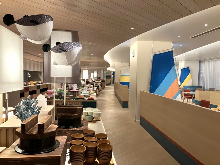 ビッフェダイニング「PUKU PUKU」は、ふぐや船の帆がモチーフのインテリア。朝・夕にふぐ料理や下関の郷土料理を楽しめる。