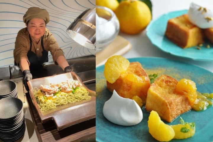 「PUKU PUKU」の朝食から。ライブキッチンでは、下関の郷土料理をアレンジしたふぐ出汁で味わう「瓦そば」や柑橘を使ったフレンチトーストを提供。