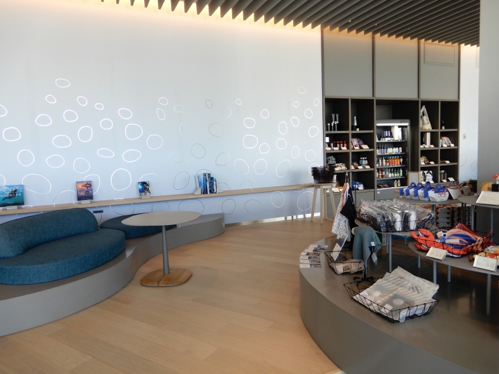 エントランスのモザイクアートにはいろんな種類のふぐ、ガラス窓の向こうに海峡の景色が広がるロビーの天井にはふぐの斑点。