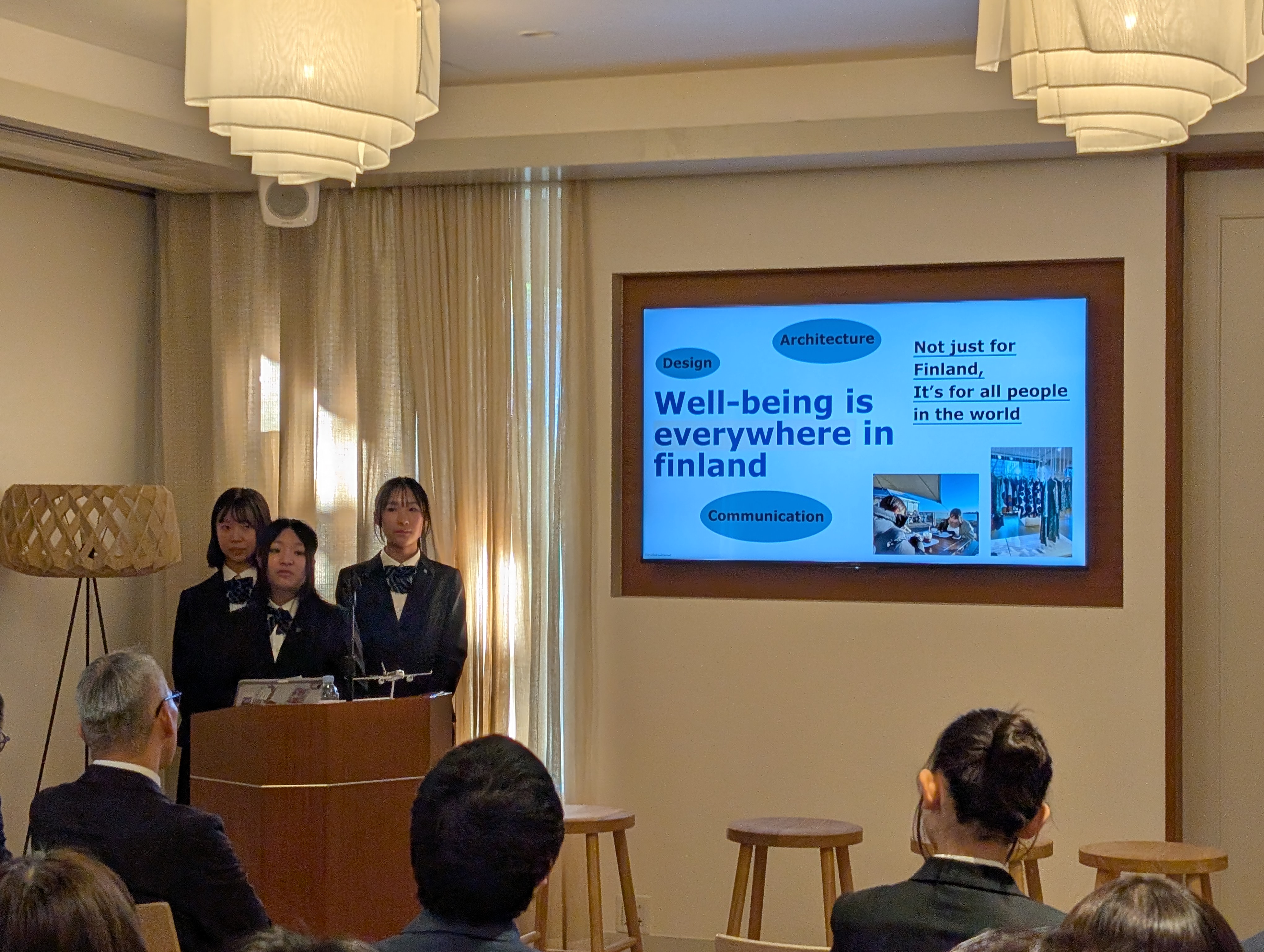 セミナーは、当日は出張のため参加できなかったフィンエアー日本支社長 倉田博樹のビデオメッセージから始まり、フィンランド教育の特徴やウェルビーイングの重要性に触れ、学びの旅を支えるフィンエアーの取り組みを紹介しました。続いて、タンヤ・ヤースケライネン駐日フィンランド大使の挨拶では、学生を迎えて大使館でイベントを開催することの特別さに触れ、フィンランドの教育理念と社会の特徴を紹介するとともに、本セミナーのテーマの重要性と、有意義な議論への期待を語りました。