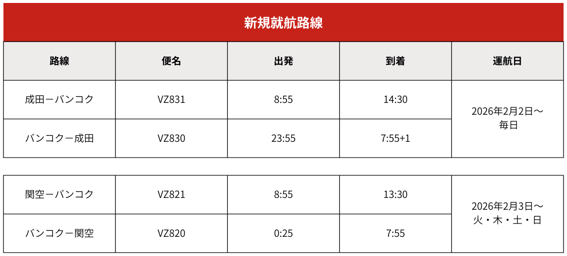 VZ 2026年2月に成田・関空〜バンコク直行便を最新機材で新規就航