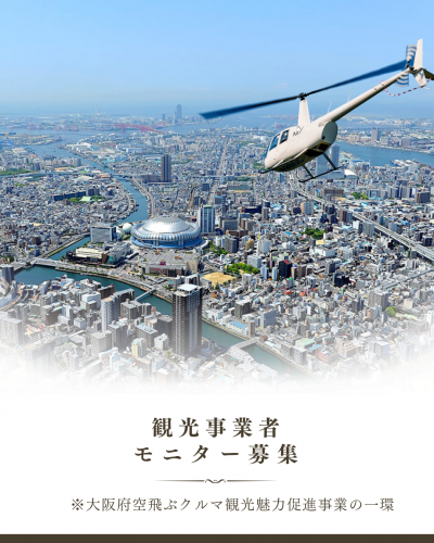 大阪府では「空飛ぶクルマ」を観光分野に活用するビジョンを掲げ、空飛ぶクルマの観光魅力促進事業として、弊社を含む「オリックス・Soracle・日本航空・AirX・JTB 共同企業体」が採択を受けて、現在観光魅力促進調査を実施中です。