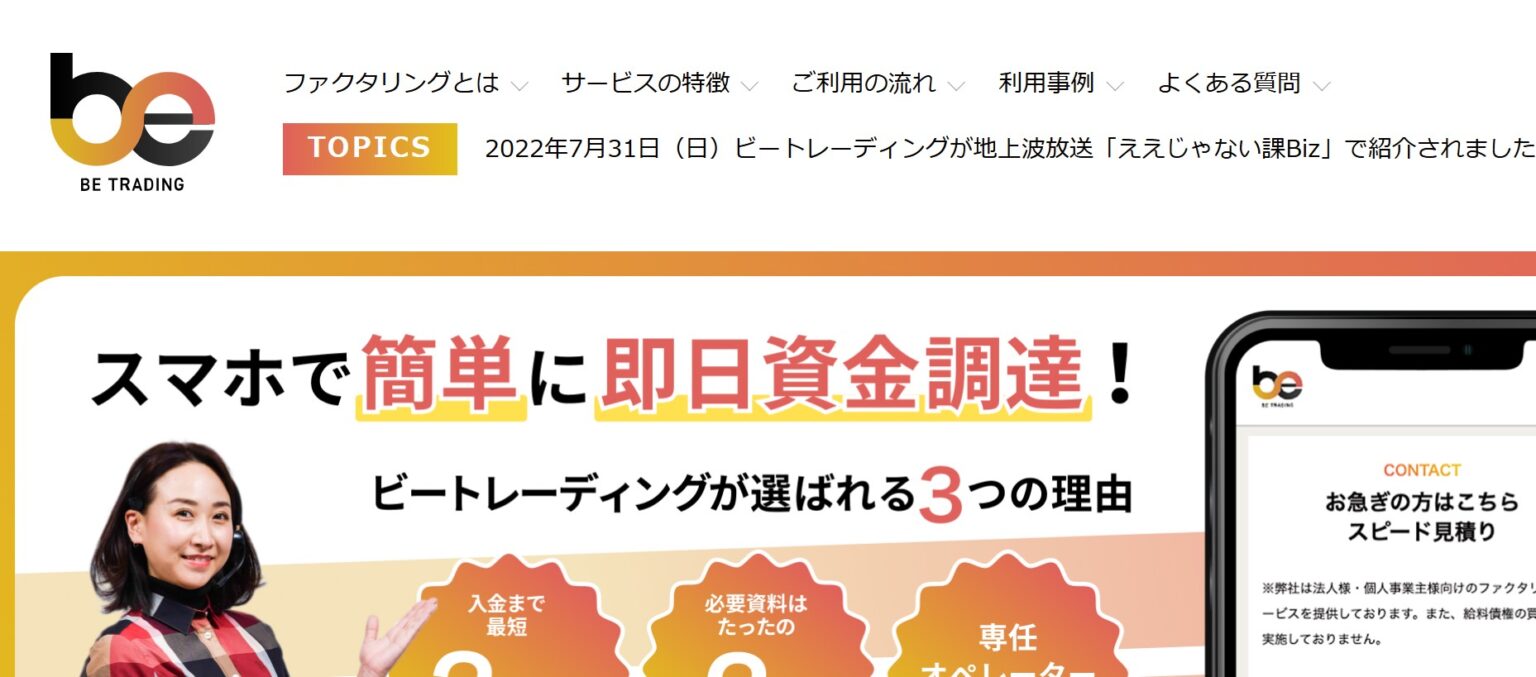 | ビートレーディング | 個人・法人 | 2.0%~12.0% | 最短2時間 | 2社間・3社間 | 30万~1億円 | 請求書・通帳コピー |