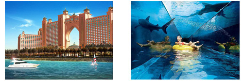 人工島パームの先端に位置する注目度ナンバー1のアトランティスホテル。22階建て1500室を誇るドバイ最大のホテルとなるアトランティスは今年の9月下旬に営業を開始。アトランティスの街を再現したホテル内は、沢山のユニークなアトラクションが用意され宿泊者を飽きさせません。イルカのラグーンや、魚の生態を知るプログラム、ピラミッド型の形をした水上コースター(27.5メートルほどの落差があり、サメの泳ぐラグーンの中をトンネルで抜けていく)などテーマパークのようなホテルとなっておりご家族のご旅行にお勧めです。