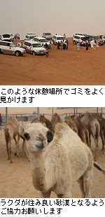 ドバイの砂漠ツアーに参加されたことのある皆さんはお気づきになったかもしれませんが、最近、ドバイの砂漠には私たち人間が捨てるゴミがたくさん残されています。よく見るのがペットボトル。休憩ポイントなどで水を飲んだ際、そのまま砂に埋めていってしまうようです。そしてそのプラスチックごみが風に吹かれて、ラクダのいるところまで飛んでいき、ラクダが食べて病気になってしまうケースをよく耳にします。