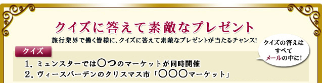 5つのマーケットが同時開催 教会や博物館、由緒ある建物などはイルミネーションに彩られ、プリンチパル・マルクトは光の洪水で満ちあふれます。 美しいイルミネーションに包まれた旧市街では、5つのマーケットが同時開催。250を超える屋台が軒を連ね、街歩きの楽しさが倍増します。 クリスマスオーナメントやおもちゃ、小粋なギフト、食欲をそそる美味しい料理や飲み物など、さまざまな屋台が旧市街に大集合。 お気に入りの逸品を探して、気ままな散策も楽しい体験です。ホテルでの2泊(朝食付き)、バス1日乗車券、旧市街のガイドツアーなどを含んだ 特別パッケージは140ユーロから。 [期間]2007年11月26日〜12月23日/日〜木11:00-20:00、金・土11:00-22:00 [場所]旧市街(Altstadt)