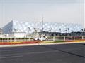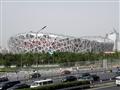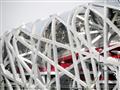 | 中国国際航空の機内。ヘッドレストカバーも五輪のマークが | 北京首都国際空港のロビーにある販売店では、さまざまなオリンピックグッズが販売されている | 開、閉会式をはじめメイン会場となる北京国家体育場。愛称は「鳥の巣」 | メイン会場の外観は鉄骨が複雑に組み合わされており、まさに鳥の巣をイメージさせる | 水泳競技が行われる「水立方」。内部は外光を取り入れ明るい構造になっている |