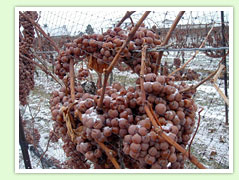 ワイン通の間でナイアガラを何よりも有名にしたのが、アイスワインの存在です。アイスワインは、熟したブドウをそのまま1月頃まで置いて凍ったものを収穫して作るデザートワイン。収穫は気温がマイナス8℃を下回った真夜中に行われすぐに圧搾されます。皮と水分、種は凍っているため、得られるのは糖度と酸味が凝縮した果汁のみ。できあがるのは、とろりとして甘く、そして絶妙な酸味をもつ逸品。同じブドウの量から通常の7分の1ほどの少量しか作ることができない、大変貴重なワインです。