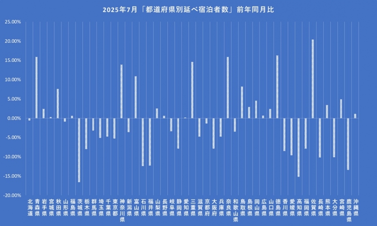 2025年7月の全国延べ宿泊者数は5575万人泊で、前年同月比2.6%減となった。特に外国人宿泊者は同4.2%減の1398万人泊となり、前年の水準を下回った。一方で、8月は全体で6682万人泊とわずかに持ち直し、日本人が同0.7%増の5329万人泊、外国人も同1.4%増の1353万人泊と増加に転じた。