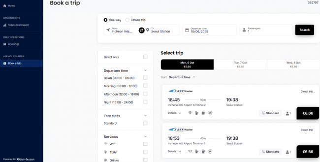 Agent Portal はシンプルな設計で、期間ごとの販売実績を管理する”Sales Dashboard”、成立した予約を管理する“Bookings”(Bookings上で、予約の変更や払い戻しも可能)、実際に予約する“Book a trip”の3つの機能がある。Book a trip の画面では、上記のように From/To、そして日付で検索すれば条件に合う電車、バスもしくはフェリーが検索される。