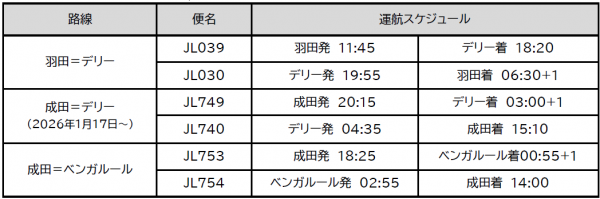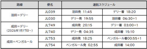 新設する便名は成田発JL749/デリー発JL740で、機材はボーイング787-8を投入する。1月17日~2月28日は成田20時15分発・デリー翌3時00分着、デリー4時35分発・成田15時10分着とし、3月1日以降は成田発を20時35分、デリー発の成田到着を15時20分に変更する。いずれも毎日運航で、運航は関係当局の認可を前提としている。