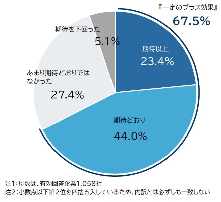 10月13日に閉幕した大阪・関西万博について、帝国データバンクが実施した企業アンケートでは、万博が日本経済に与えた影響を「期待以上」と評価した企業が23.4%、「期待どおり」が44.0%となり、あわせて7割近くの企業が一定のプラス効果を認めた。開幕前の4月調査で「プラスの影響を期待する」とした企業が43.5%にとどまっていたことから、実際の成果は当初の期待を上回った形となった。