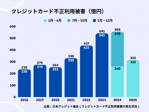 日本クレジット協会の統計によると、2024年のクレジットカード不正利用被害額は555億円。5年前の約2倍に達している状況だ。