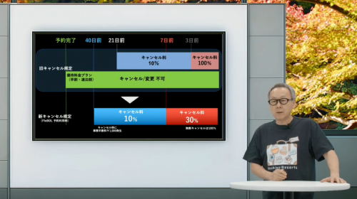 なお、キャンセル規定については直販サイトでの自社予約が対象。他のOTAや旅行会社経由の販売については、反映可能な部分については反映するが、OTAの機能的問題や旅行業法上のルールなどから、これまで通りの販売とする場合があるとした。