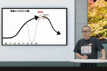 また、インバウンドについては成長スピードが鈍化していることを指摘し「どこかで(伸びが)平らになっていくだろう」と予測。2025年の訪日外国人については4200万人から4300万人で収束する見通しを示した。同氏は「国は6000万人を目指しているが、感覚では4000万前後になるのでは。同じ島国のイギリスも大体その位」とし、インバウンドをブームで終わらせるのではなく、どうやって数字を維持していくのかを検討していく必要があるとした。