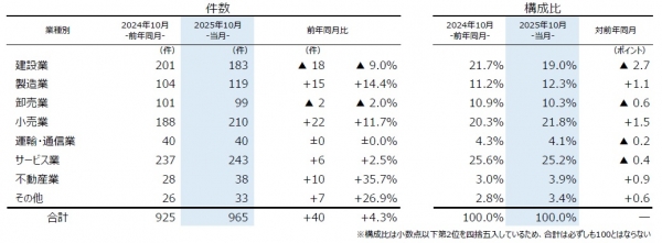 帝国データバンクがまとめた2025年10月の企業倒産動向によると、倒産件数は前年同月比4.3%増の965件となり、今年最多を記録した。年間では12年ぶりに1万件を超える可能性が高まっており、アフターコロナで顕在化する経営課題が各地で深刻化している。